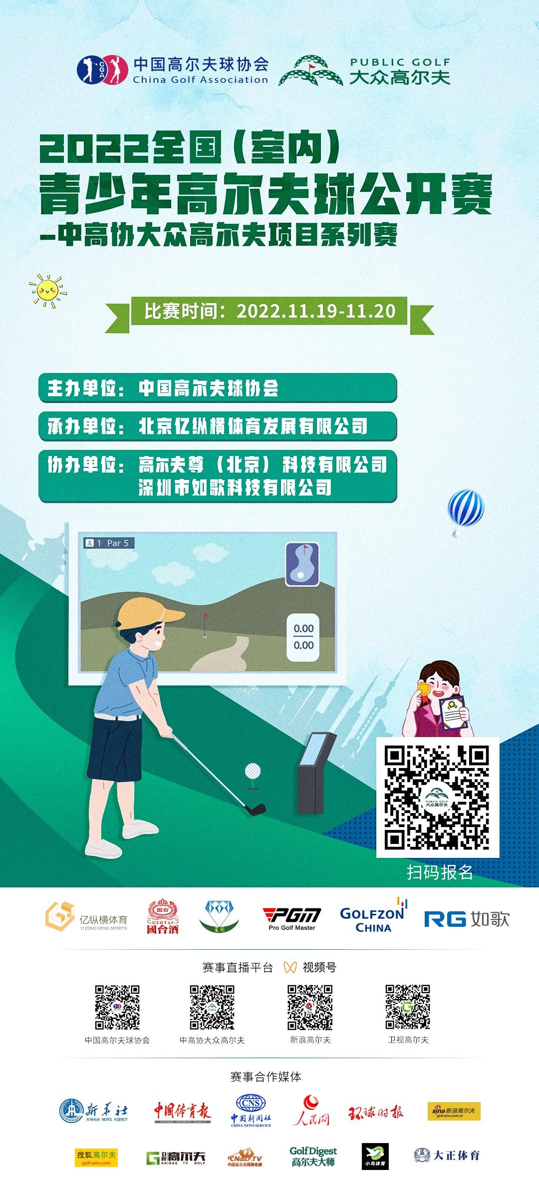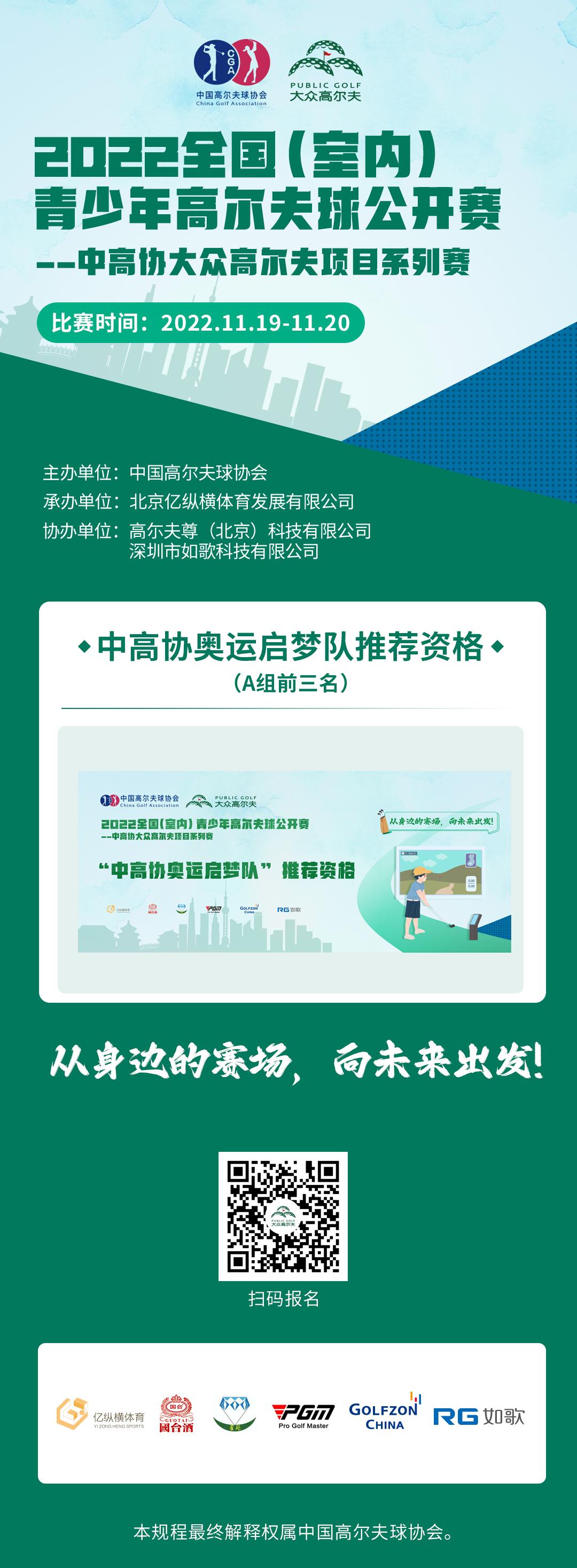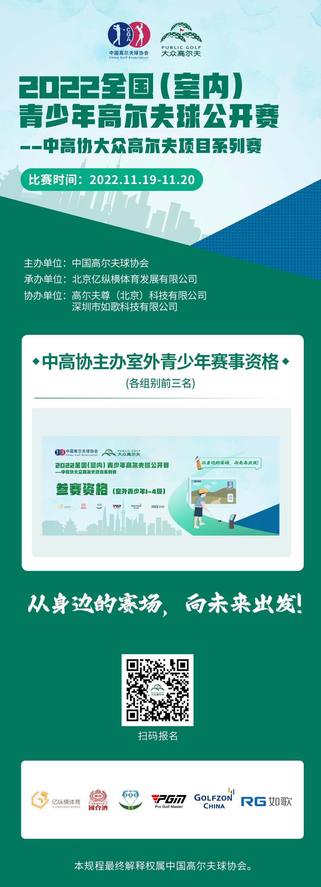 11月1日,中国高尔夫球协会官网正式公布《2022全国(室内)青少年高尔夫球公开赛》竞赛规程,标志着由中国高尔夫球协会首次主办的全国性、面向青少年人群的室内高尔夫球赛正式启动。赛事将于11月19日至20日在全国75家室内球馆举行,报名通道已开启,可扫描下图二维码进行报名。