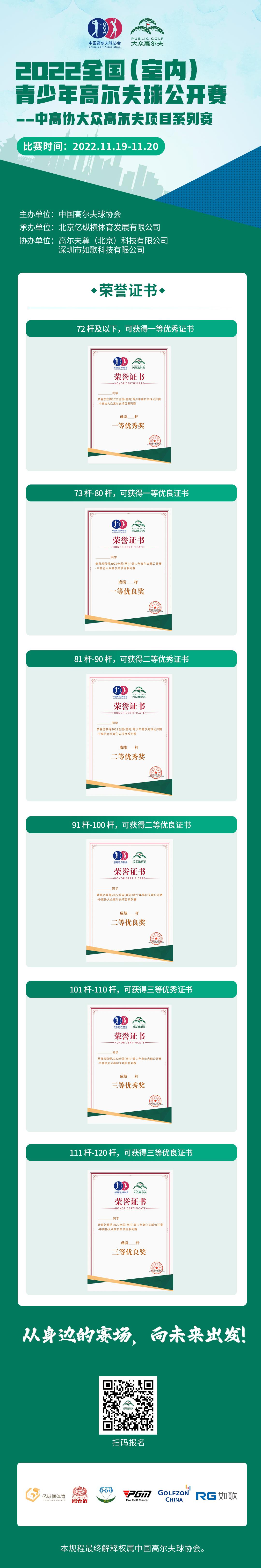 本次赛事不仅以成绩进行排名奖励排名证书,同时根据参赛选手的个人最好成绩奖励由中高协颁发的荣誉参赛证书。作为中高协大众高尔夫项目系列赛,本次赛事将纳入大众高尔夫赛事体系,未来将有机会在中高协室内青少年积分排名榜建立后获得积分,对于青少年高尔夫学习及未来学业规划起到积极作用。