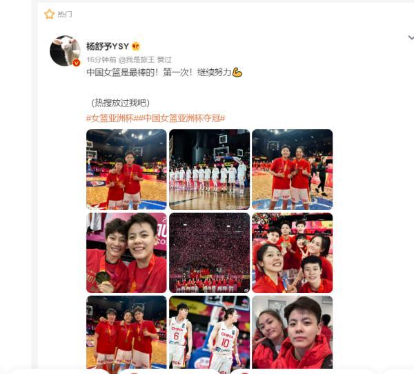 赛后杨舒予发布了夺冠九宫格照片,称:“中国女篮是最棒的!第一次!继续努力(热搜放过我吧)”很显然,热搜榜没有放过杨舒予,她很快就登上热搜榜的第一名,关注度相当高。