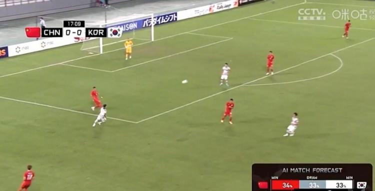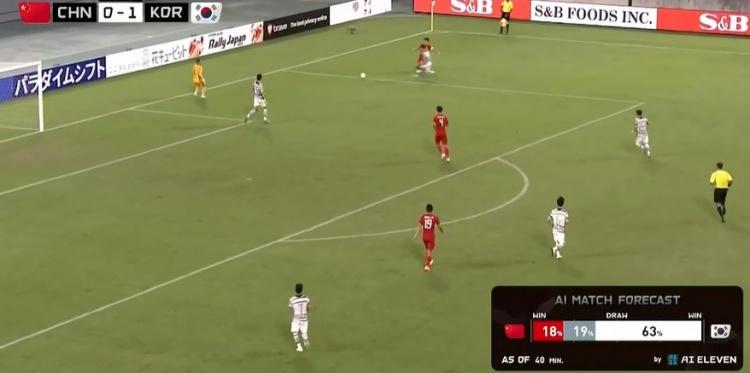 直播吧7月20日讯 东亚杯首轮,中国男足vs韩国男足,上半场43分钟,国足已0-1落后,现场AI预测国足的取胜概率仅剩18%。韩国队的胜率为63%
