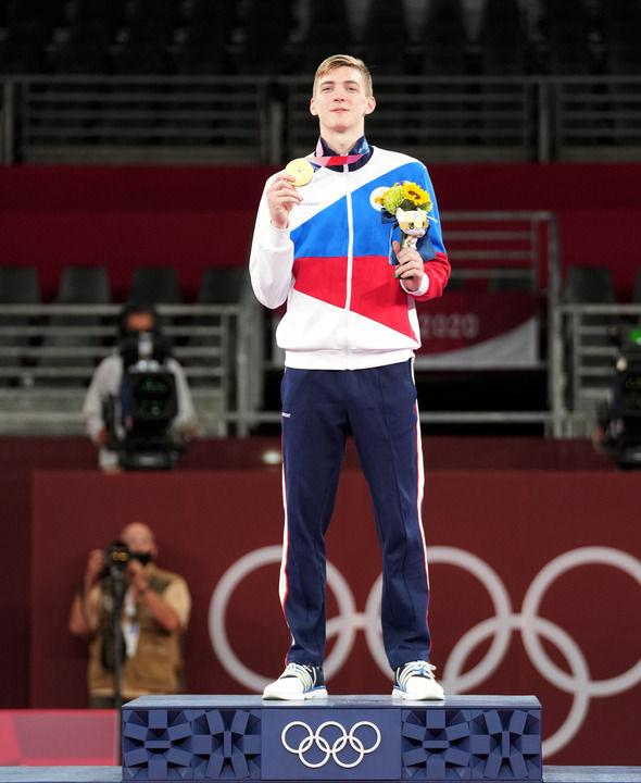 7月26日,在东京奥运会跆拳道男子80公斤级决赛中获得冠军的俄罗斯运动员赫拉姆佐夫颁奖仪式上展示金牌。新华社记者 王毓国 摄
