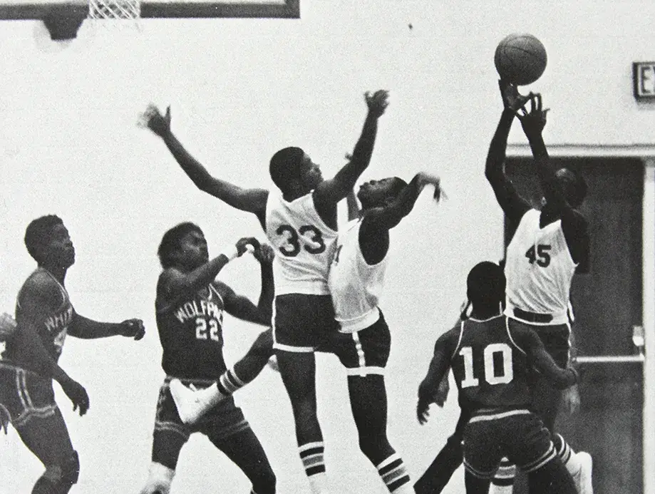 兰尼高中1978-79年年鉴当中的乔丹照片,右边穿着45号的乔丹在争抢篮板。