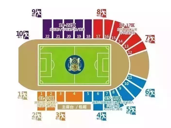 持有1区、2区、3区、4区(VIP)球票的观众从越秀公园小北门进入,3号门入场,从3号门离场;