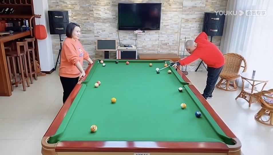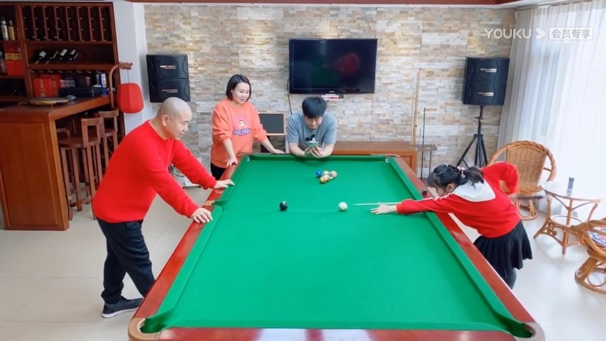 “能叔”上来就是一杆远台进球,还把母球甩到一个非常理想的位置,搭档妻子一边举杆一边说:“你这是有点欺负孩子们。“然后一杆打偏。轮到兄妹组合上手,“能叔”故意把球挪到距离洞口很近的位置,可惜女儿出杆还是差了一点点。一场家庭台球赛在笑声中结束,欢乐比胜负更重要。