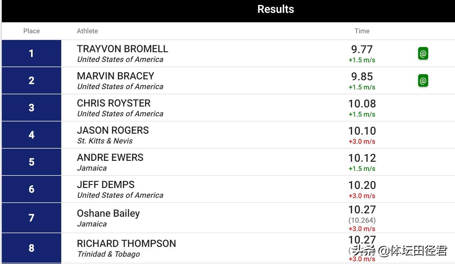 第二、布罗梅尔成为田径历史第九位、美国第四位打开9秒80大关的选手,正式晋级世界顶尖高手行列,与80后百米五虎处在同一级别高度。