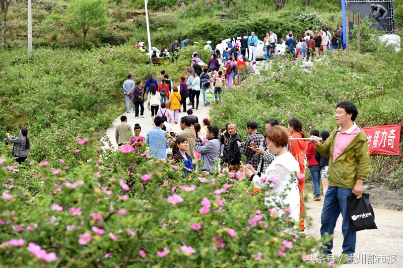 (旅客在贵州省龙里县茶香刺梨景区赏刺梨花。)