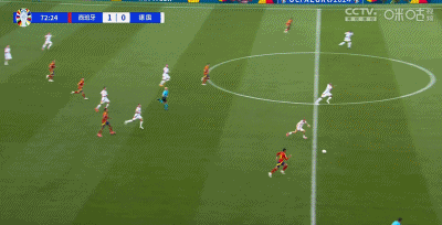 第67分钟,西班牙的反击,克罗斯战术犯规拉倒奥尔莫,吃到黄牌↓