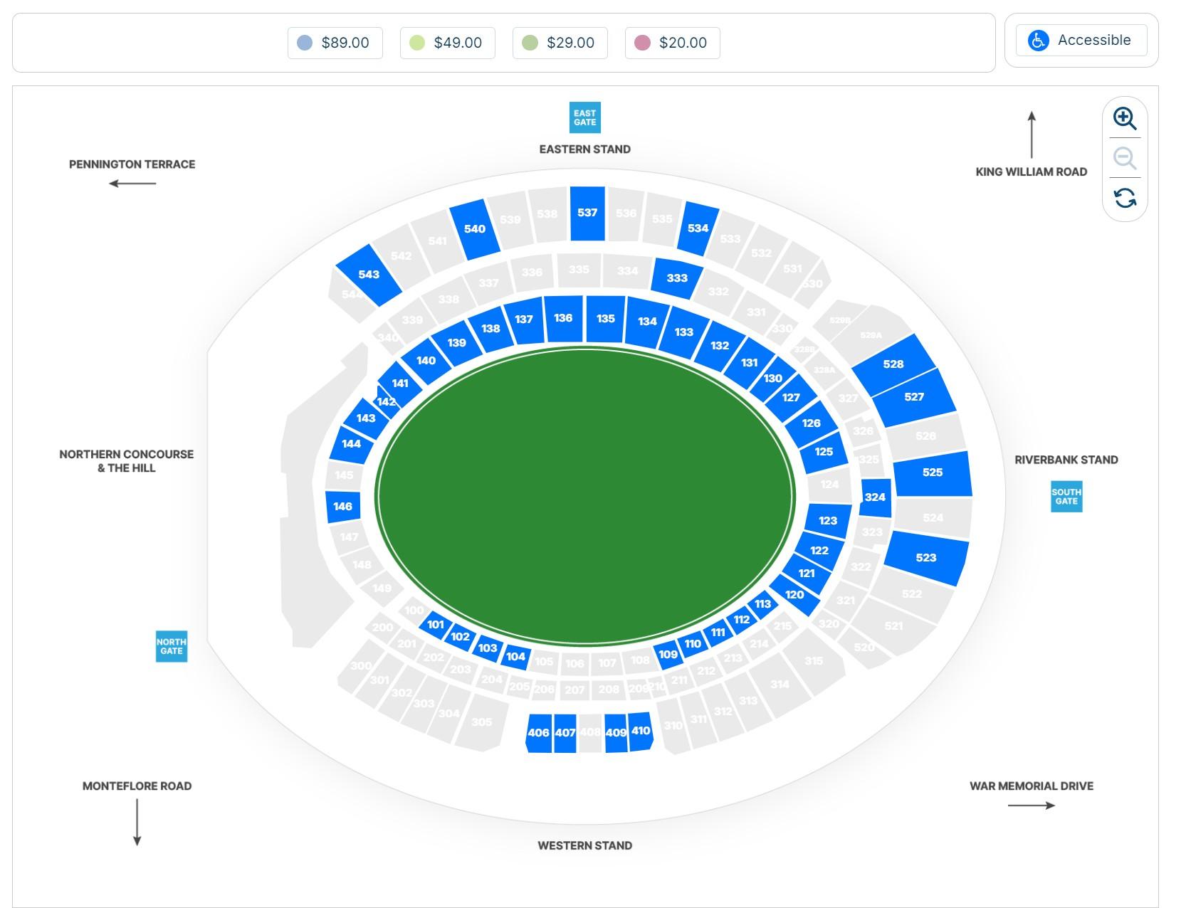 其中票价分为5档,底层看台部分视野遮挡区域价格为20澳币(约合人民币95元),C类看台成人票价格为29澳币(约合人民币138元),C类学生票(4-14周岁)价格15澳币(约合人民币71元)。