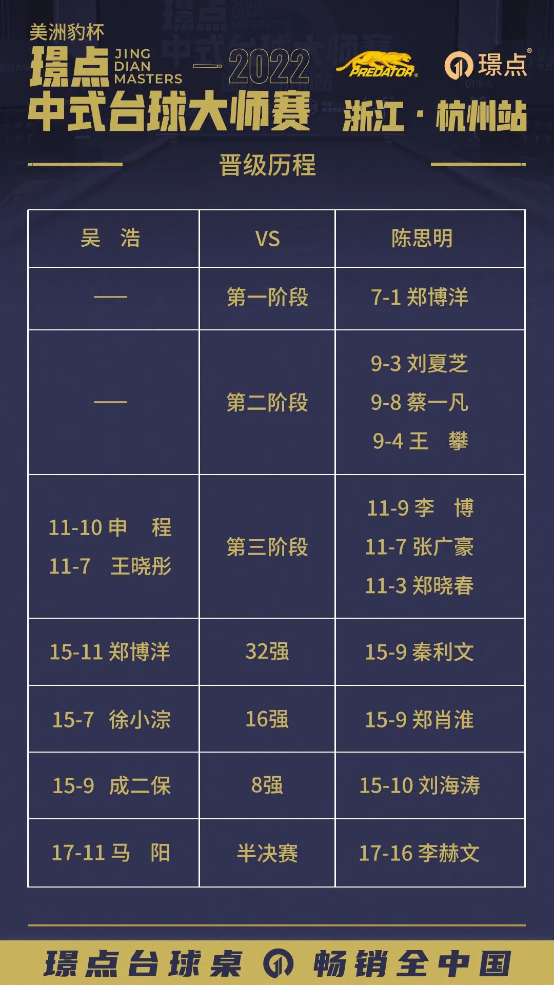 回顾二人晋级之路,吴浩虽偶有双赛点之争,但全胜晋级势头正猛,近一月除了在大奖赛败给韩雨,状态几乎无人能敌;另一方面,陈思明则因慢热表现,两次跌入败部生死战,状态起伏不定。据统计,大师赛期间陈思明遭遇男子选手8次,七胜一负,其中击败的包含李赫文、刘海涛、秦利文、李博等一众名将。两人今日巅峰对决,既是为荣誉而战,亦是为20万冠军奖金而战,生死荣辱全网瞩目。