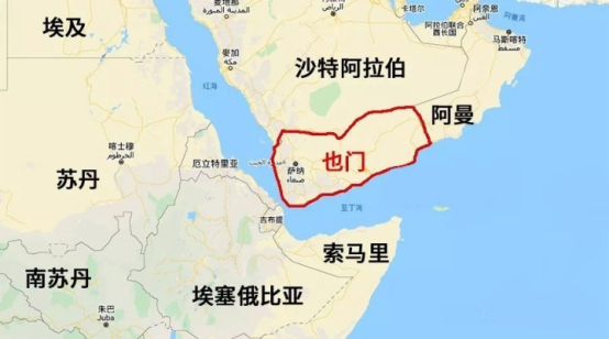 也门位于阿拉伯半岛的西南部,濒临红海、亚丁湾和阿拉伯海,其陆上邻国只有北部的沙特、和西部的阿曼。