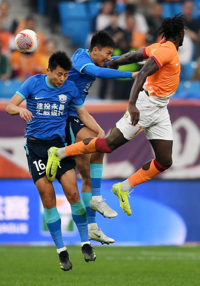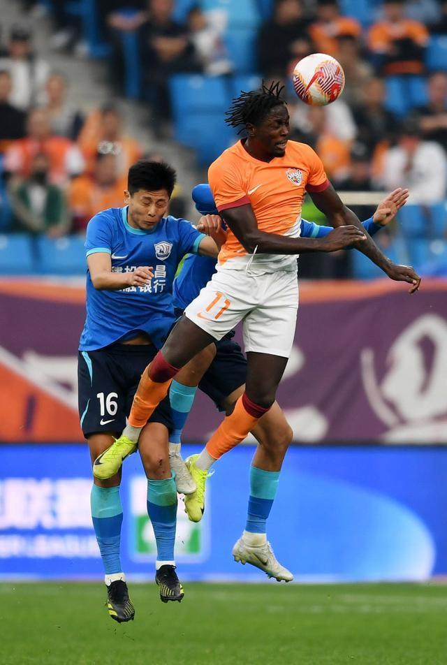 11月2日,沧州雄狮队球员郑凯木(左)与青岛海牛队球员博阿基耶(右)争顶头球。新华社记者 李紫恒 摄