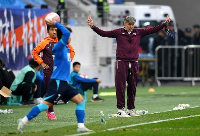 11月2日,青岛海牛队主教练亚森(右)在比赛中指导球员。新华社记者 李紫恒 摄