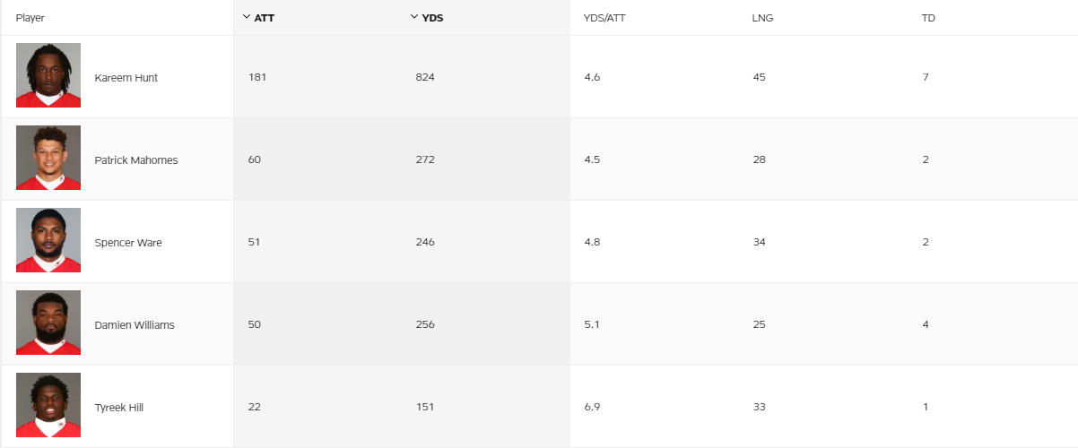 卡里姆-亨特,斯班赛-维尔,达米恩-威廉姆斯组成了跑卫委员会。加上马霍姆斯和泰瑞克-希尔,整个赛季酋长的路面进攻非常高效。赛季完成100码推进以上的球员中,均码最低的也有4.5码。