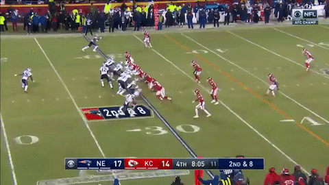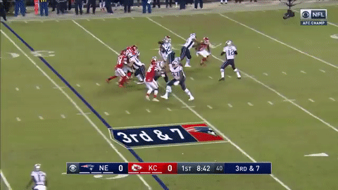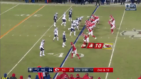 加时赛爱国者获得了先进攻的机会,朱利安-埃德尔曼连续两次在三档完成中路接球,分别拿下20码和15码,进入酋长半场。面临又一个三档10码,这一次是罗布-格隆考斯基接球15码转换首攻。