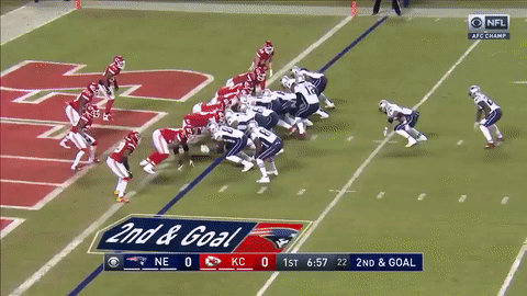 酋长在本方端区的弃踢让爱国者在酋长半场开始持球进攻。科达雷勒-帕特森(Cordarrelle Patterson)的15码接球让爱国者进入红区。比赛进入第二节,爱国者来到1码线后,布雷迪的假跑真传反而迷惑了自己,他在得分线上的传球被酋长线卫雷吉-拉格兰德(Reggie Ragland)轻松抄截!