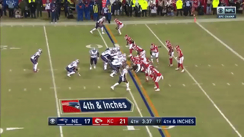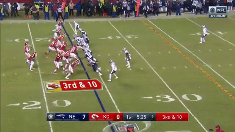 爱国者借助朱利安-埃德尔曼的19码接球以及索尼-米歇尔的10码冲球,他们来到酋长半场。在酋长25码线面对四档半码,爱国者冲球失败,无功而返!