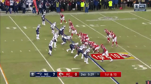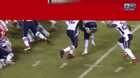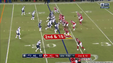 汤姆-布雷迪还有两分钟的时间。随着朱利安-埃德尔曼接球20码,爱国者逐渐推进到酋长半场。来到34码线,布雷迪传给罗布-格隆考斯基的传球被抄截,然而由于酋长的提前进线防守犯规,这次抄截被取消。此后罗布-格隆考斯基又在安全卫埃里克-贝里(Eric Berry)头上完成25码接球!