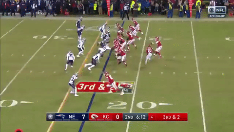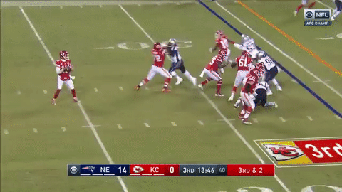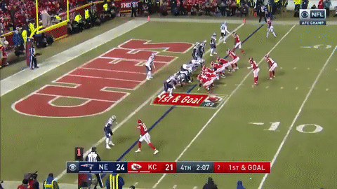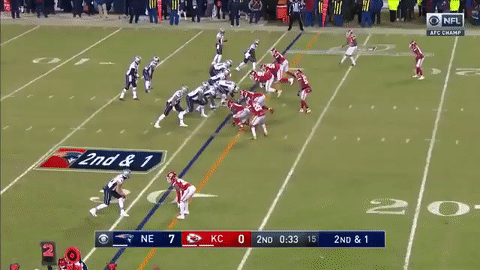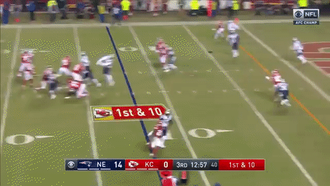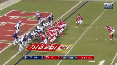 酋长达米恩-威廉姆斯(Damien Williams)接短传跑下33码进入红区。比赛进入第四节后,凯尔西造成对方在端区内犯规,酋长在1码线上得球。此后,马霍姆斯冲出口袋,把球甩进达米恩-威廉姆斯怀里,传球1码达阵得分!比分变成了爱国者17:14酋长。