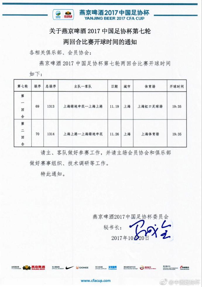 北京时间10月20日,中国足协公布了今年足协杯决赛两回合的日期,11月19日,申花坐镇主场迎战上港,11月26日,上港回到主场面对申花。