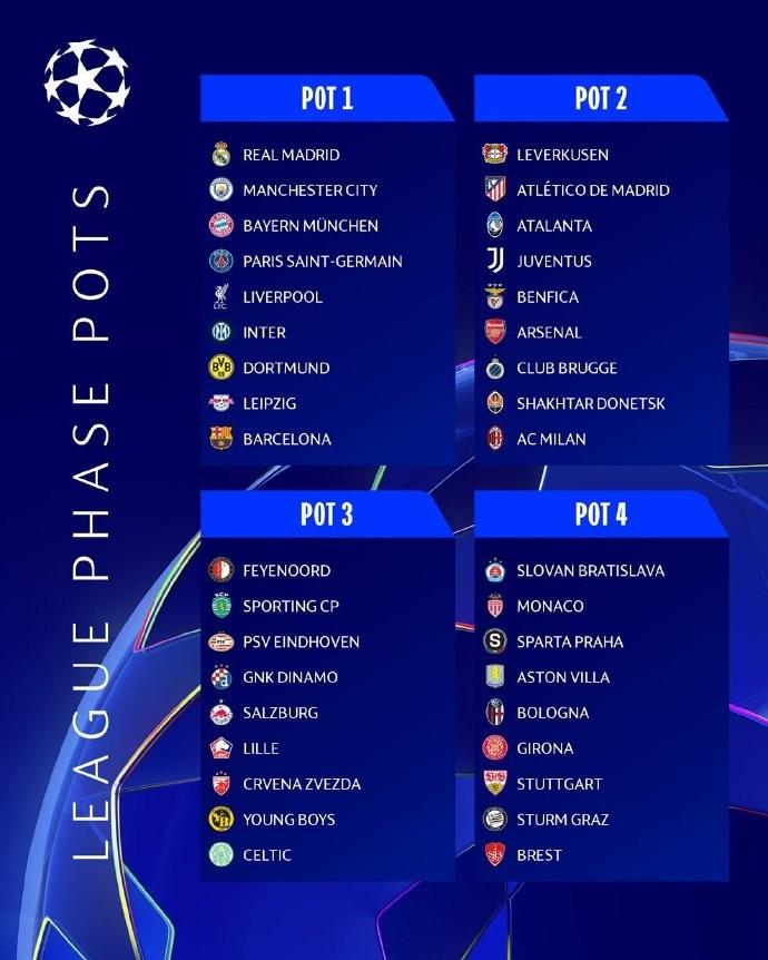 联赛阶段的抽签其实也并不复杂,36支球队按欧战积分被分成4档,每档9队,每队从各个档位抽取2个对手,分别打1场主场或客场。所有36支球队都将使用实体球进行人工抽签,对于人工抽出的每支球队,会通过软件随机抽出他们的对手,这个过程也会决定哪些比赛在主场进行,哪些比赛在客场进行。