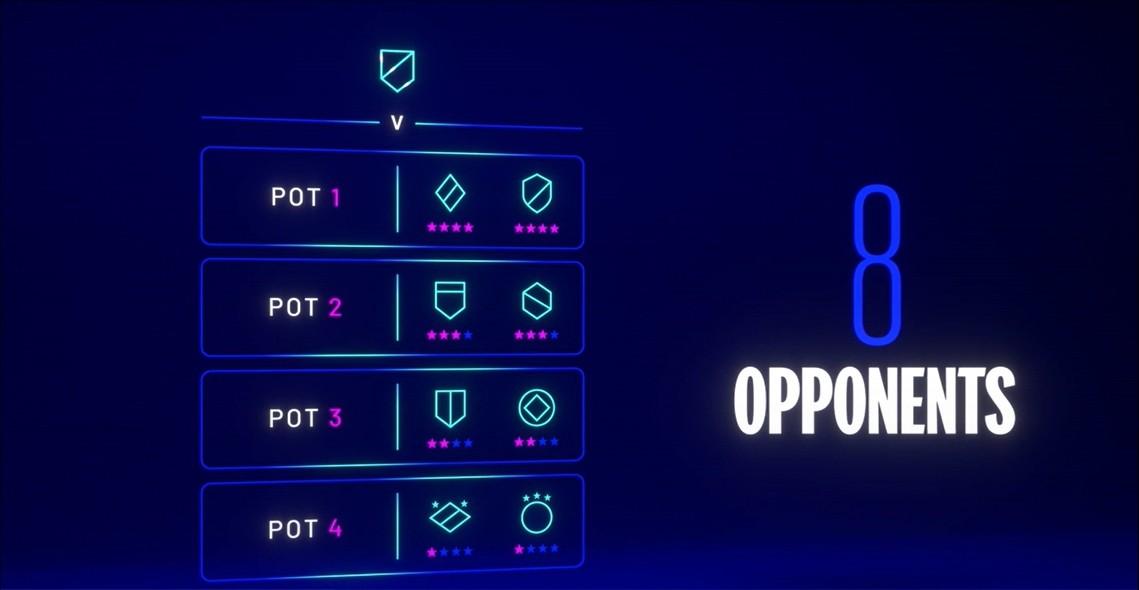 为了确定这8个不同的对手,各队将根据俱乐部系数被分配到四个档次中。上届的欧冠冠军自动作为第一档的头号种子。每支球队将从每个档次抽取2个对手,其中一个为主场比赛,另一个为客场比赛。欧联杯也将采用相同的方式进行;欧协联略有不同,在此不作详细阐述。