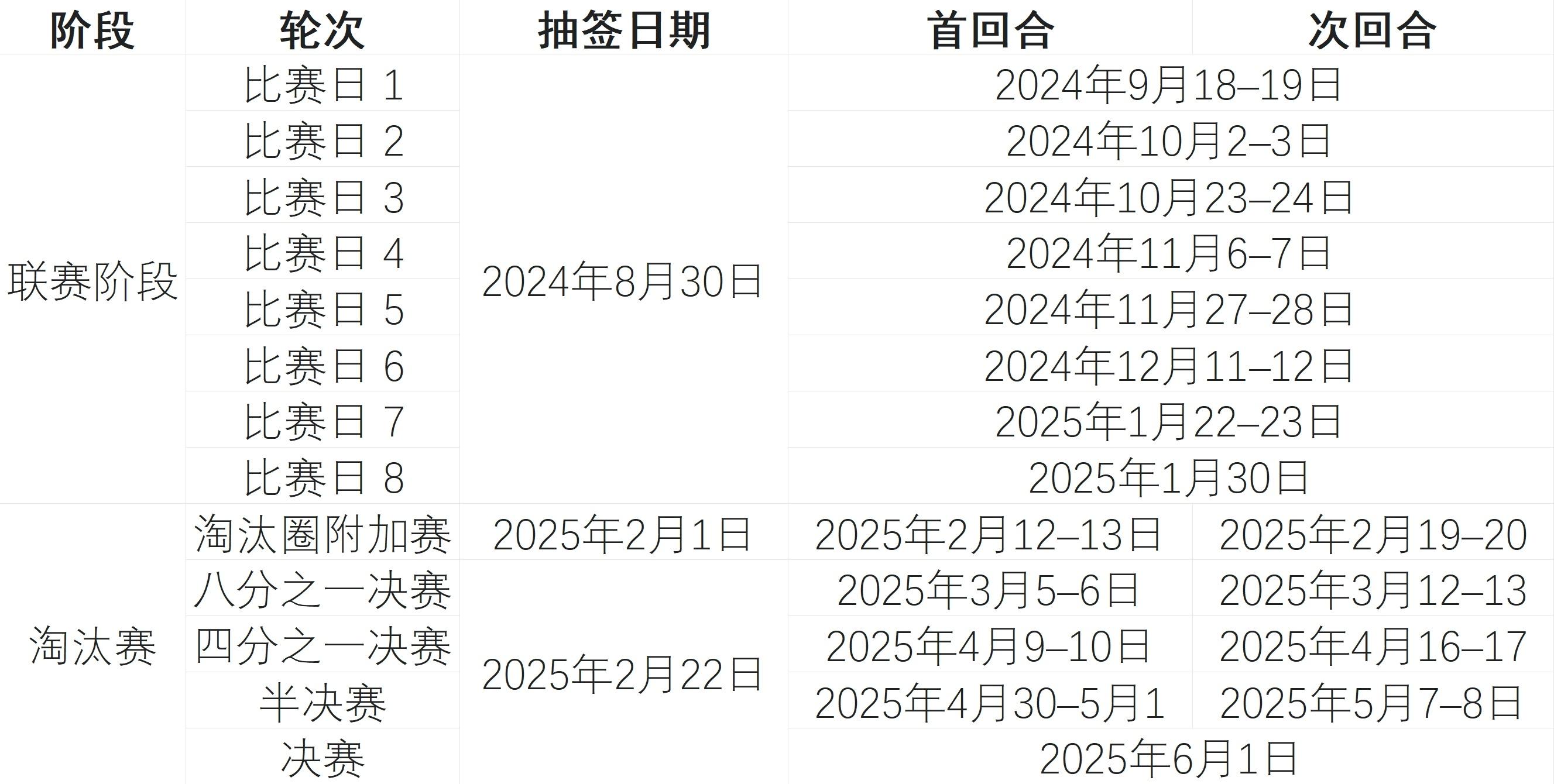 联赛阶段的首轮比赛在2024年9月17日开始,末轮到2025年1月29日结束。