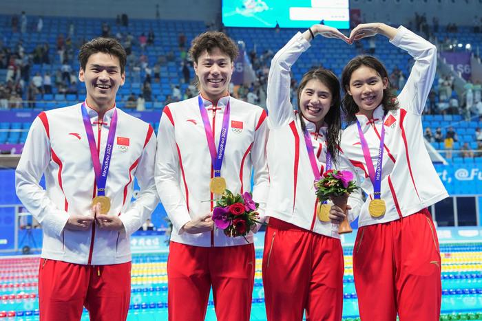 2023年的中国泳军可谓硕果累累。在7月举行的福冈世锦赛上,中国泳军夺得5枚金牌、3枚银牌、8枚铜牌,金牌榜位居第三,仅次于世界泳坛传统强队澳大利亚队与美国队,并且创造了2012年以来中国游泳队在奥运会、世锦赛两大赛事中的最佳战绩。在9月份的杭州亚运会上,中国泳军在41个游泳比赛项目中勇夺28枚金牌,不但捍卫了亚洲泳坛霸主的位置,也创造了中国体育各单项运动队在历届亚运会上的第二好成绩。