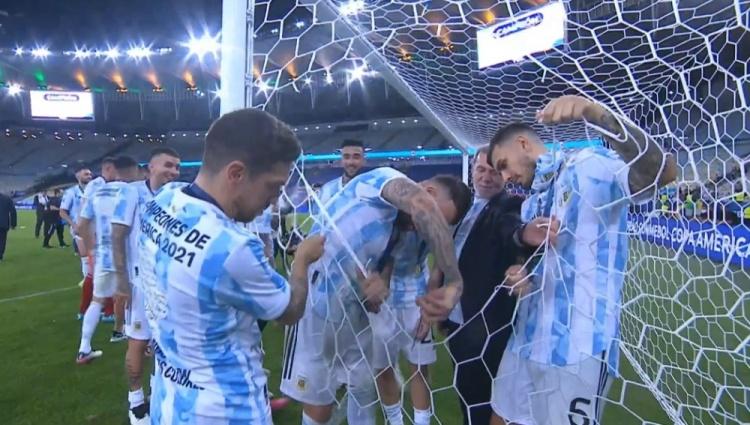 直播吧7月11日讯 美洲杯决赛,阿根廷战胜巴西夺冠。赛后阿根廷众人将马拉卡纳球场的球网剪下留作纪念。