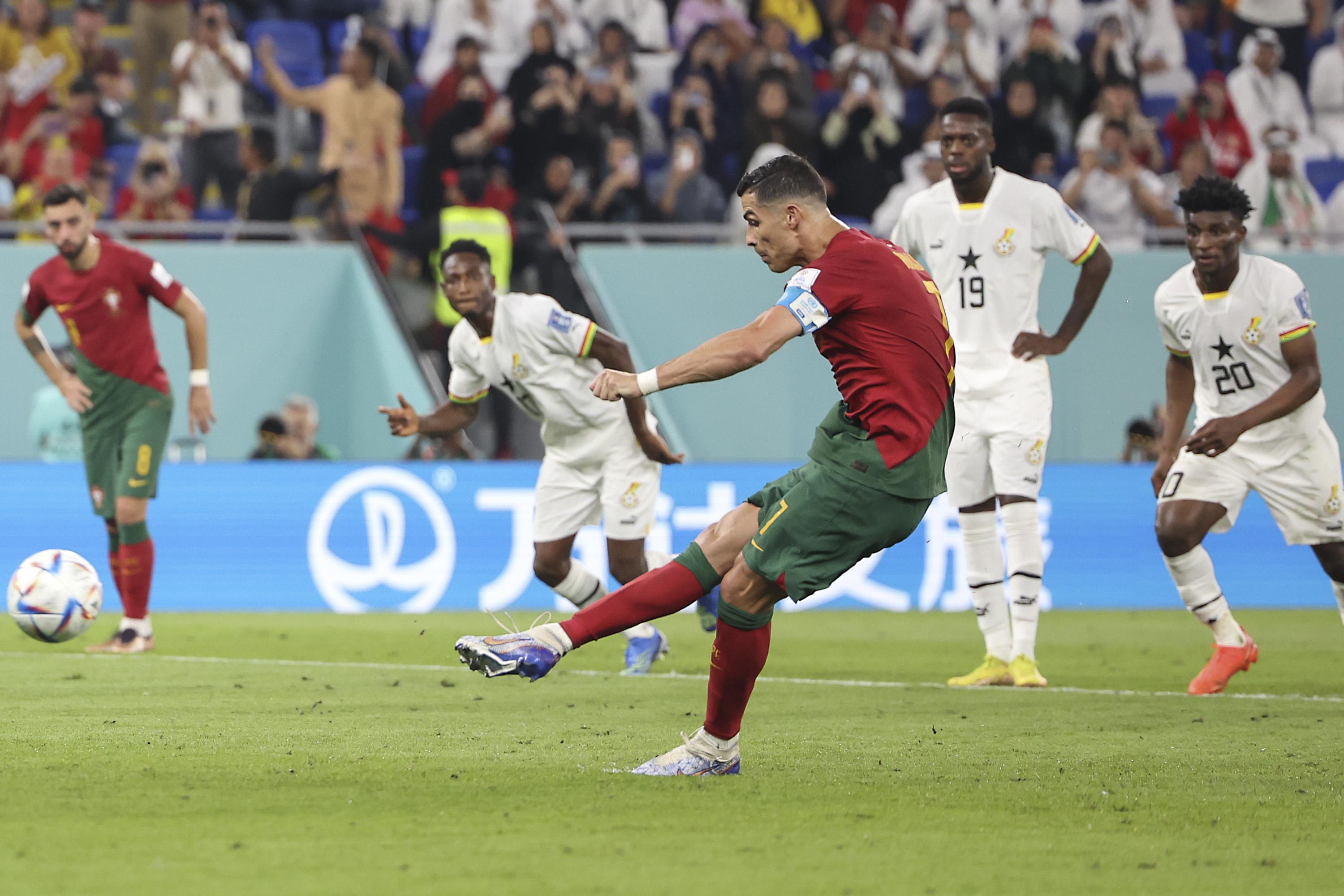 比赛上半场结束时双方均未有球入账。下半场第64分钟左右,C罗主罚命中点球,葡萄牙1:0领先加纳。