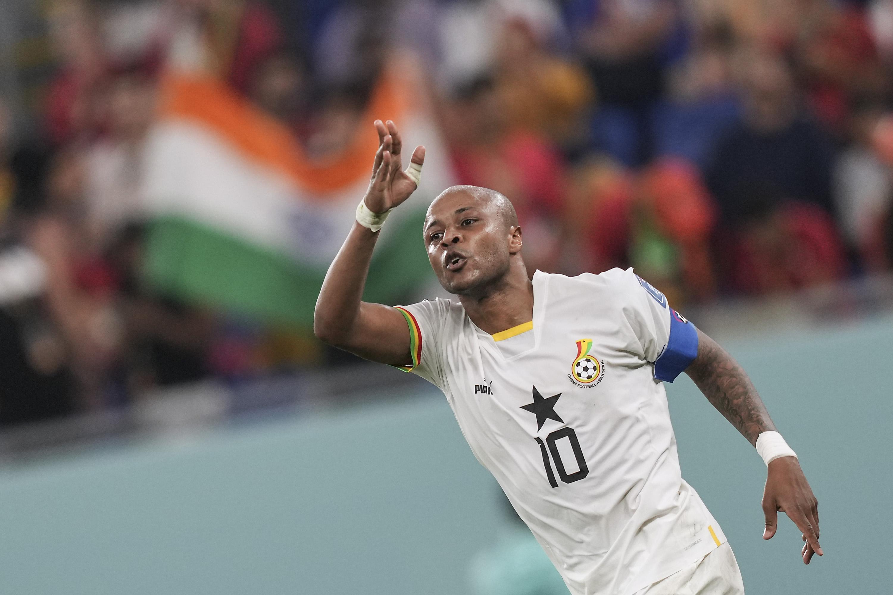 11月24日,加纳队球员安德烈·阿尤在比赛中进球后庆祝。新华社记者李钢摄