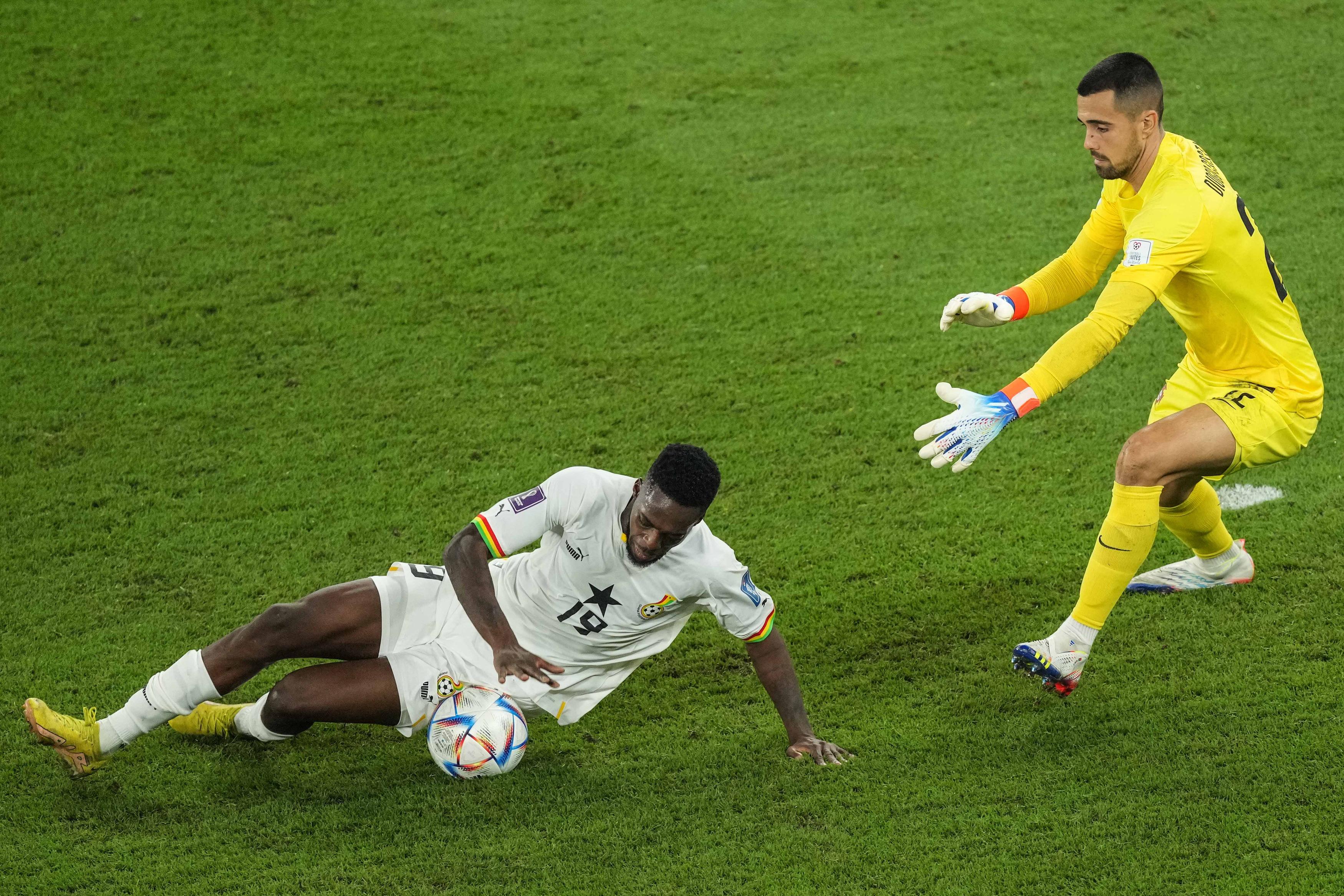 11月24日,加纳队球员威廉姆斯(左)在比赛中抢断葡萄牙队守门员科斯塔。新华社记者潘昱龙摄