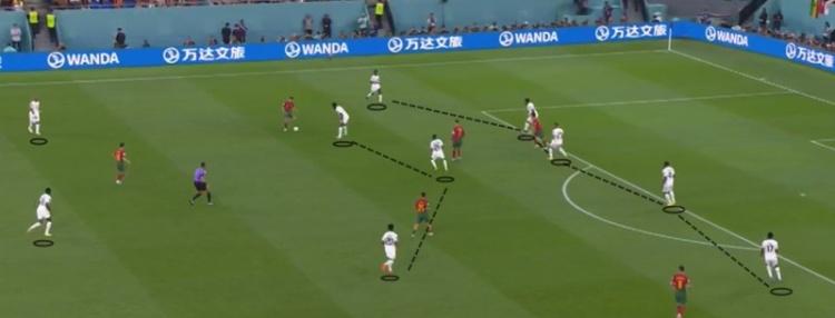 从战术图中可以看到,加纳队后场至少保持8人防守站位,而阿尤和库杜斯则负责干扰葡萄牙队队持球人,并随时准备发动反击。在边后卫助攻有限,技术流中场过于扎堆中路的情况下,葡萄牙队逐渐陷入进攻死局——高控球率无法转换为有效的射门机会,C罗在前场孤立无援,他和菲利克斯之间也缺少连线。