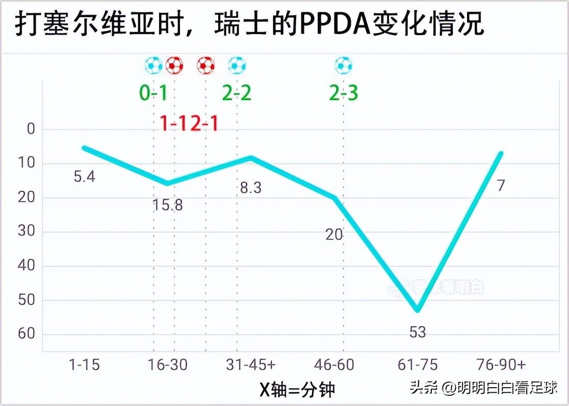 这是比赛中PPDA值的变化,瑞士大部分时间内逼抢力度都很强,特别是前15分钟和最后15分钟,都低于7。