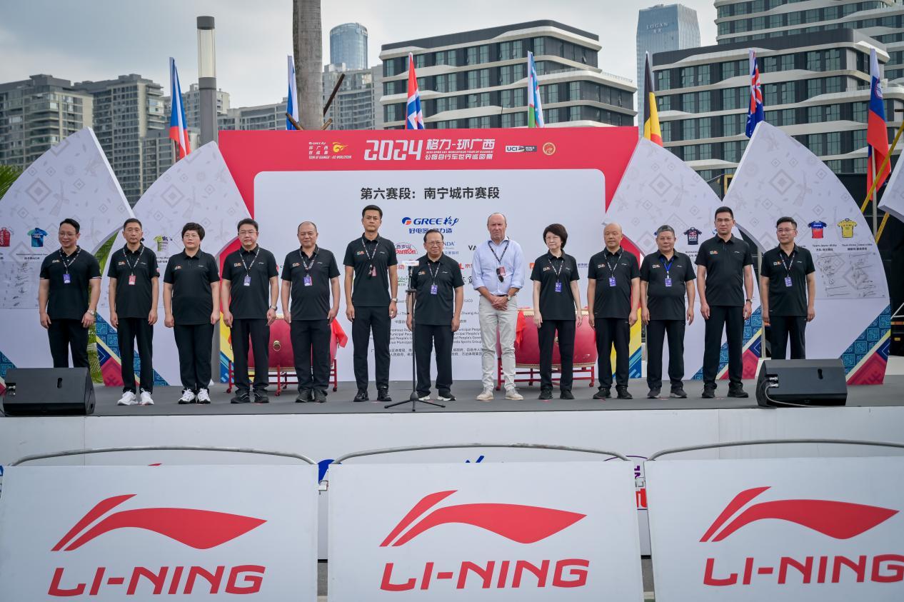 13点50分,2024格力-环广西世巡赛第六赛段发车仪式在广西文化艺术中心举行,广西壮族自治区党委常委、南宁市委书记农生文,国际自行车联盟职业自行车委员会主席汤姆·凡·戴姆,中国自行车运动协会副秘书长韩峰,广西壮族自治区党委宣传部二级巡视员薛彬,广西壮族自治区公安厅副厅长罗卫东,广西壮族自治区住房城乡建设厅副厅长刘哲,广西壮族自治区体育局副局长甘永辉,广西壮族自治区农业农村厅二级巡视员陈国良,南宁市委常委、统战部部长、副市长张自英,广西国家安全厅处长黄俊,万达文旅集团执行总裁张春远,万达投资集团南宁项目公司总经理李宝忠,格力电器市场总监朱磊等领导和嘉宾出席了发车仪式。南宁市委常委、统战部部长、副市长张自英致辞,广西壮族自治区党委常委、南宁市委书记农生文宣布开赛。