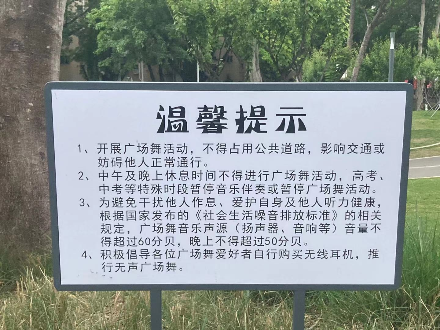 在梅林中康公园走访时,记者看到公园广场上设置有广场舞温馨提示牌,其中第3条提示,根据国家发布的《社会生活噪音排放标准》相关规定,广场舞音乐声源(扬声器、音响等)音量不得超过60分贝,晚上不得超过50分贝。