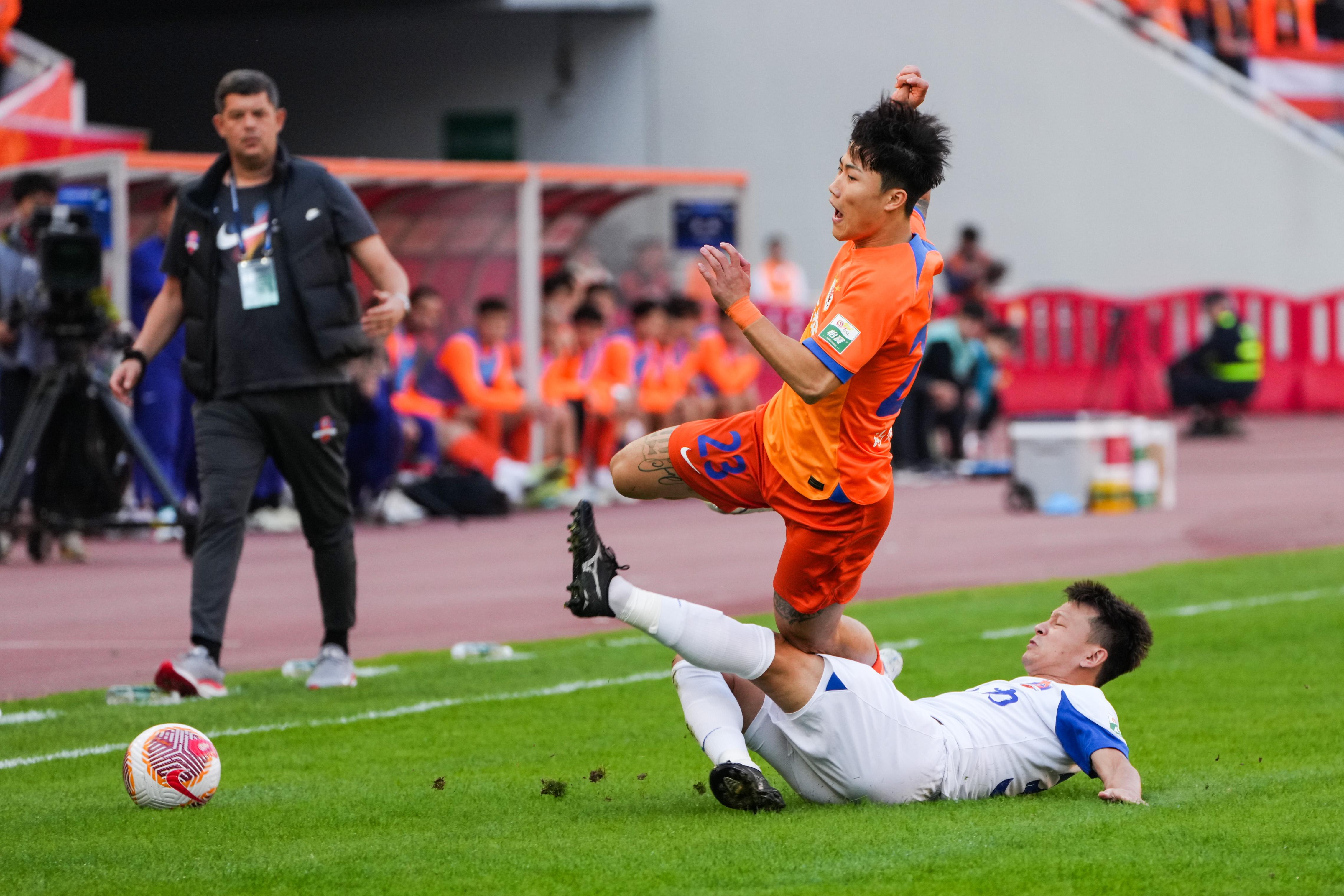 11月2日,山东泰山队球员谢文能(上)在比赛中突破遭到对方球员铲断。 新华社记者 朱峥 摄