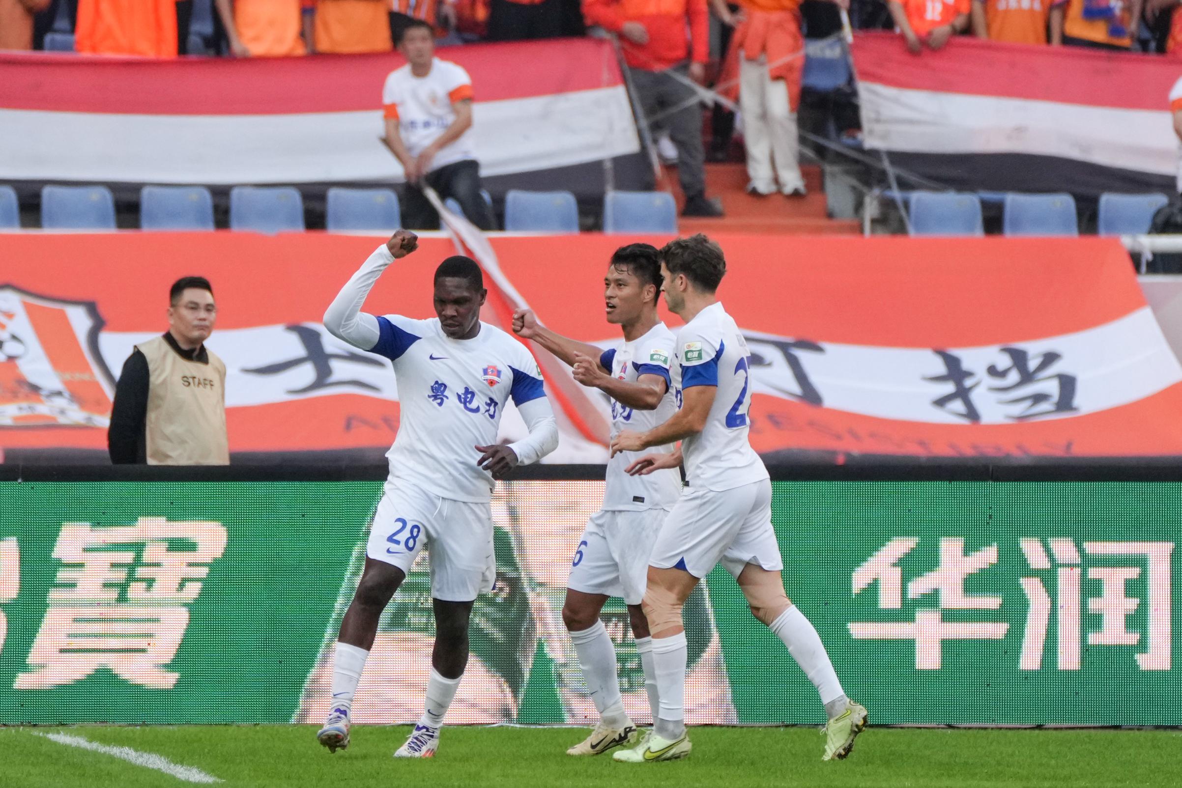 11月2日,梅州客家队球员马里(左)在比赛中庆祝进球。 新华社记者 朱峥 摄