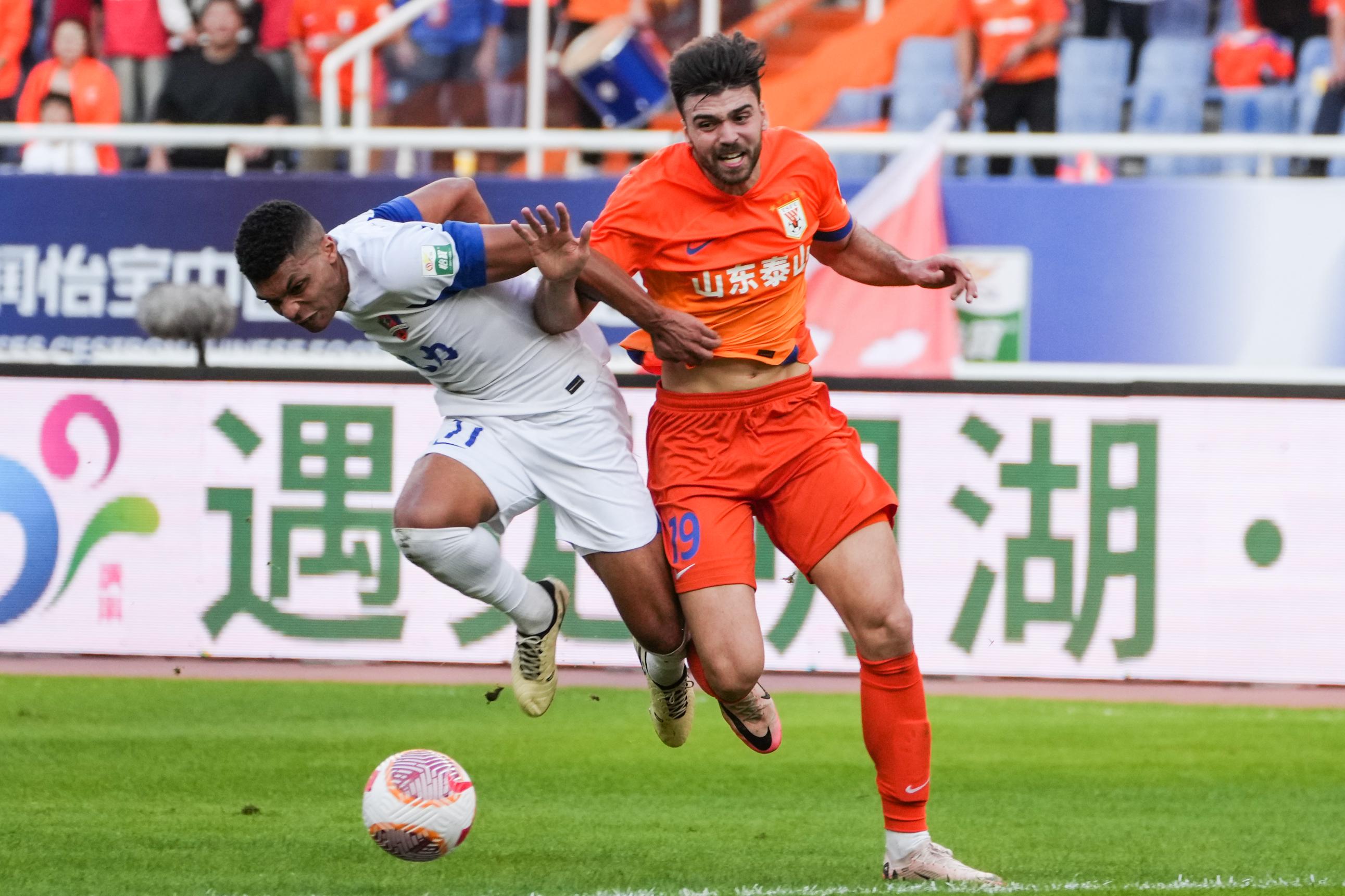 11月2日,山东泰山队球员克雷桑(左)在比赛中拼抢。 新华社记者 朱峥 摄