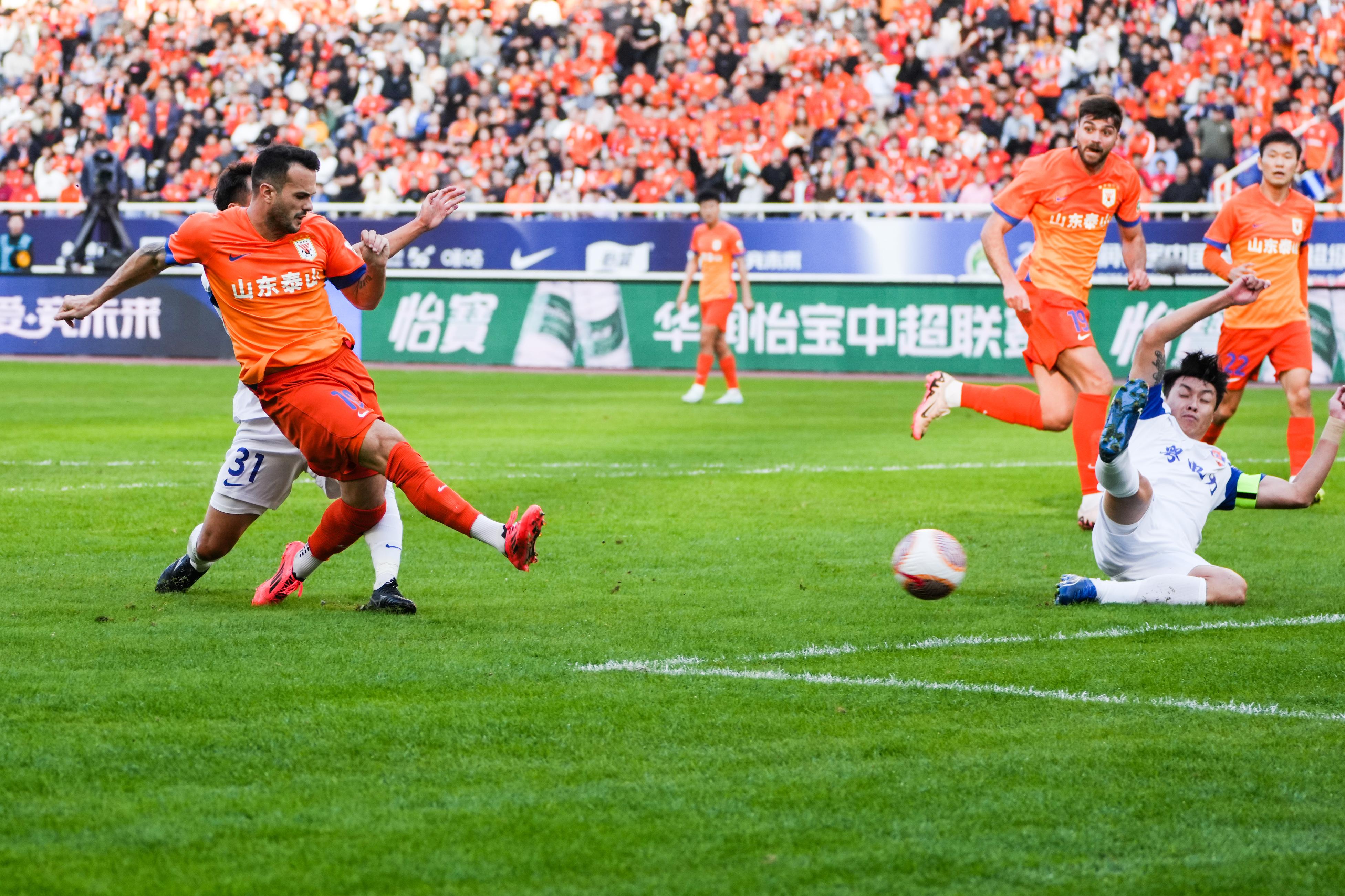 11月2日,山东泰山队球员卡扎伊什维利(左)在比赛中射门。 新华社记者 朱峥 摄