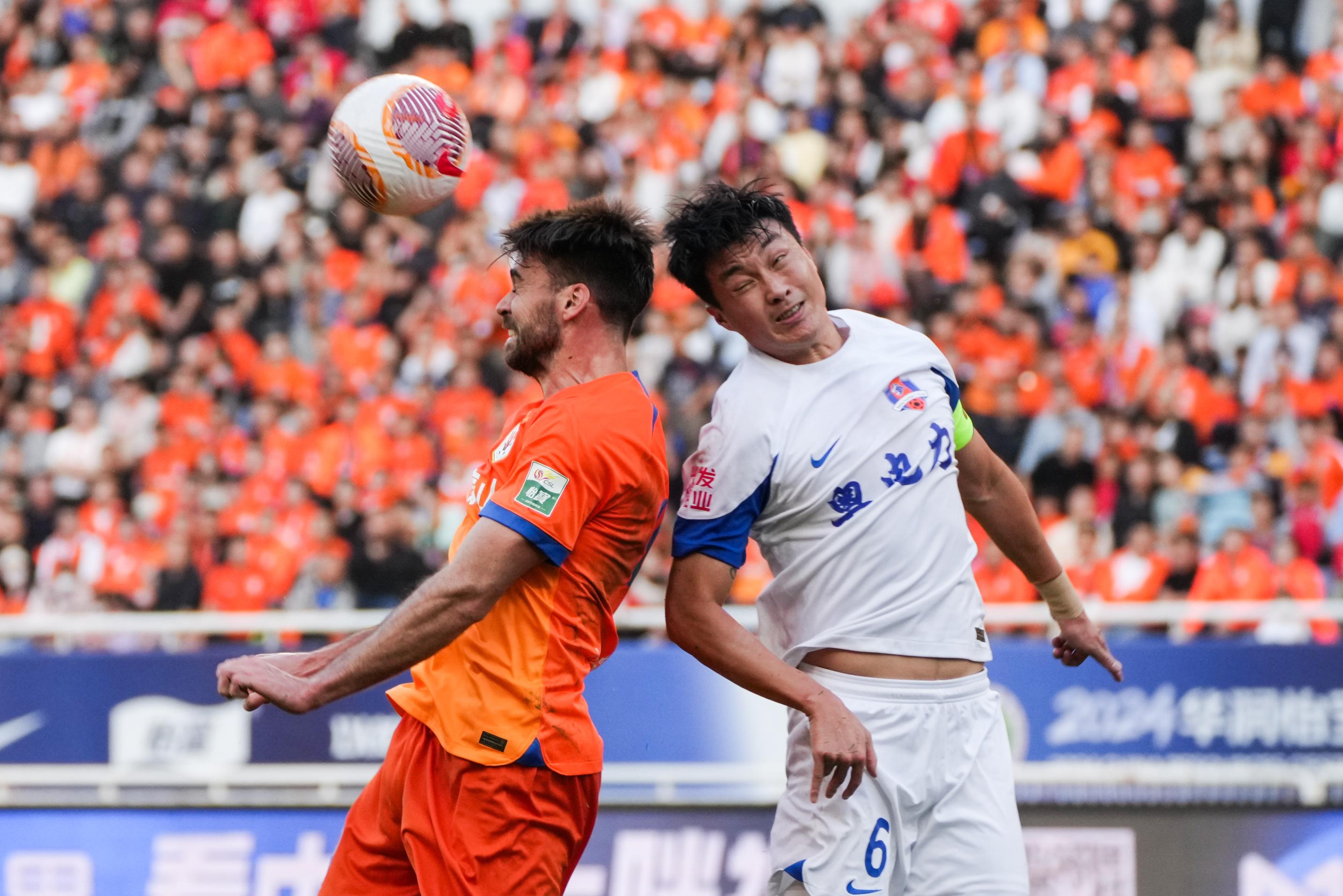 11月2日,山东泰山队球员泽卡(左)和梅州客家队球员廖均健在比赛中争顶。 新华社记者 朱峥 摄