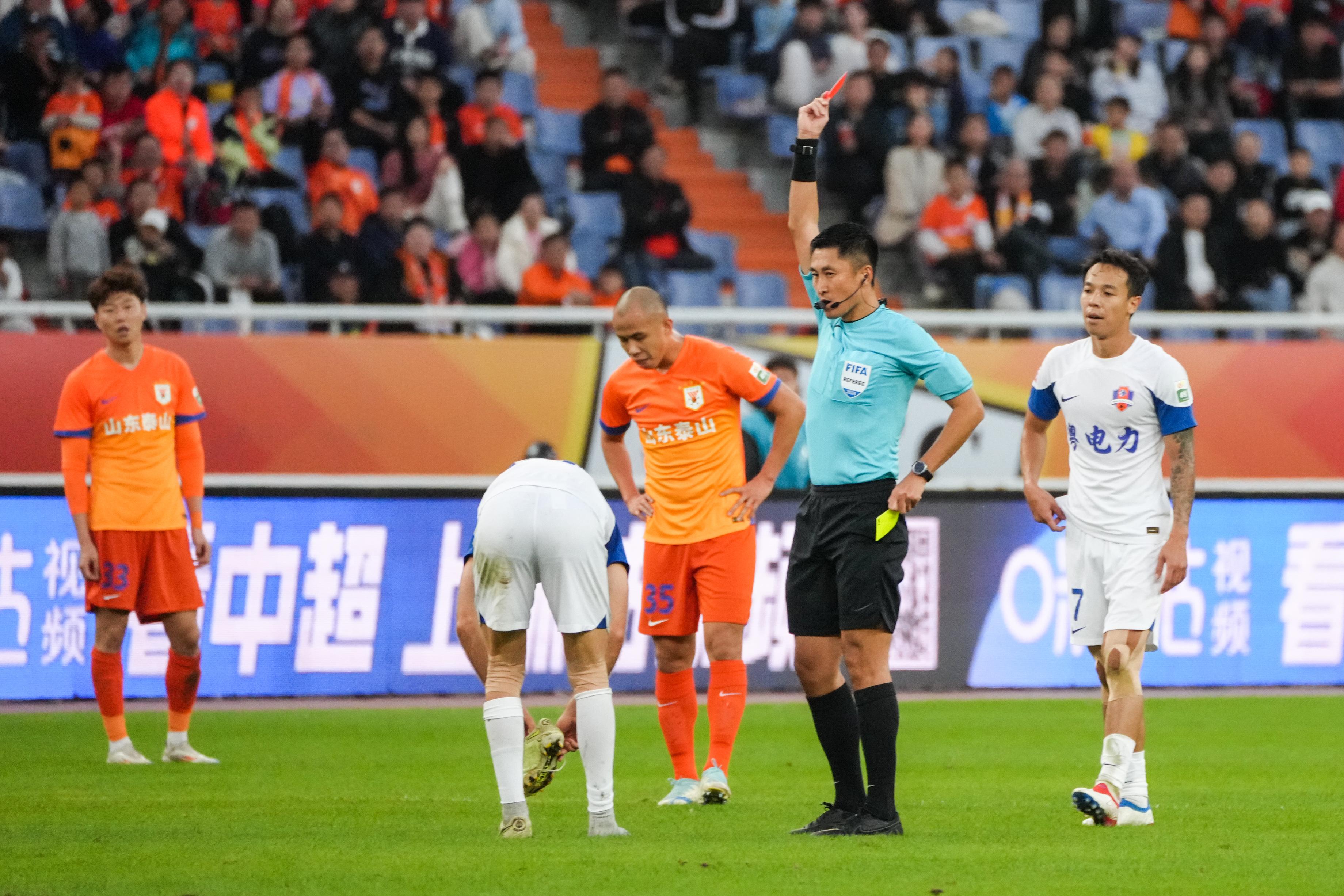 11月2日,本场主裁判马宁(右二)向梅州客家队球员科索维奇出示红牌。 新华社记者 朱峥 摄