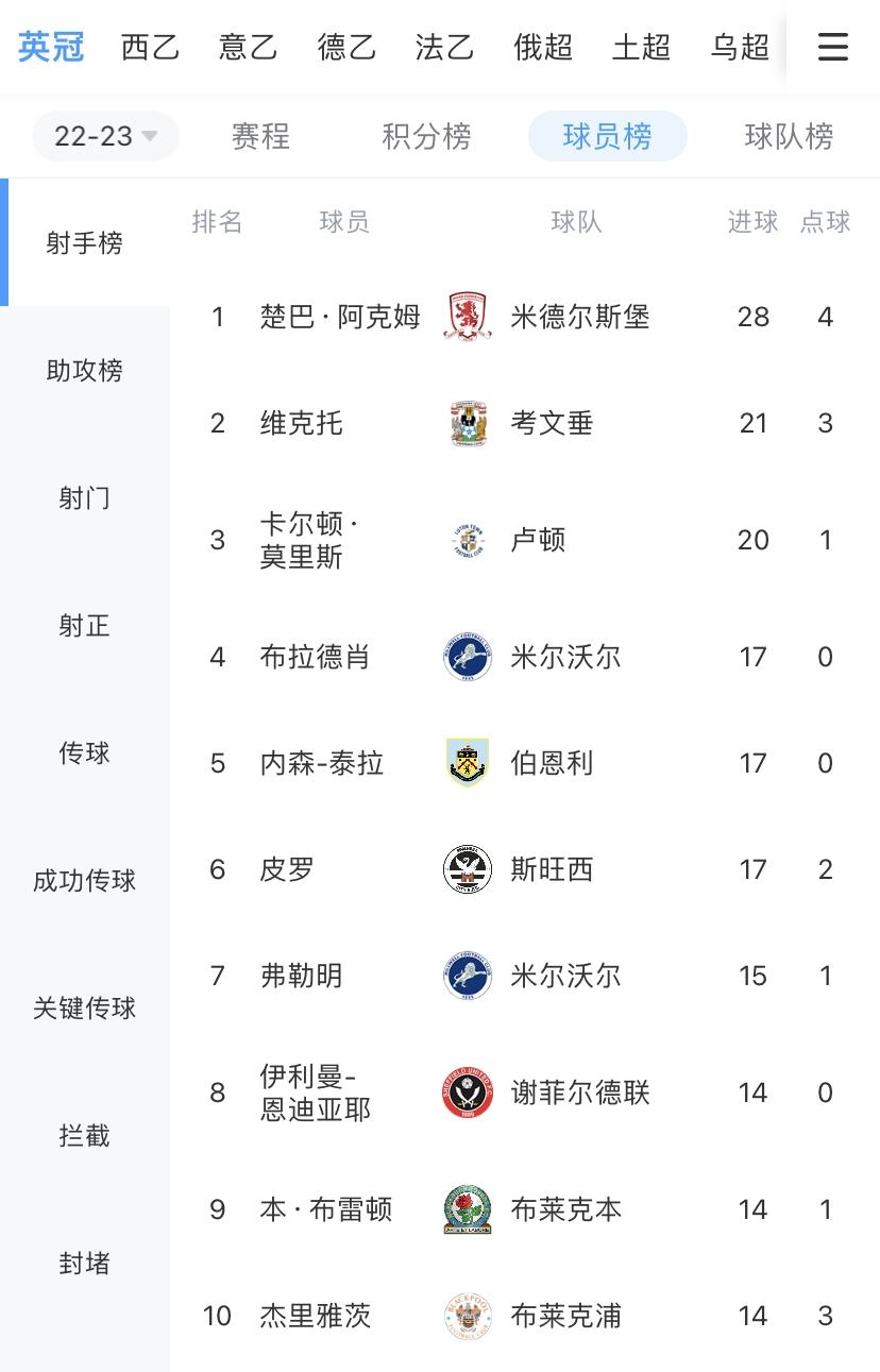 射手榜方面,阿森纳青训出品,27岁的阿克蓬打入28球捧得金靴,考文垂前锋维克托-基奥克雷斯21球、卢顿前锋卡尔顿-莫里斯20球分列二三位。