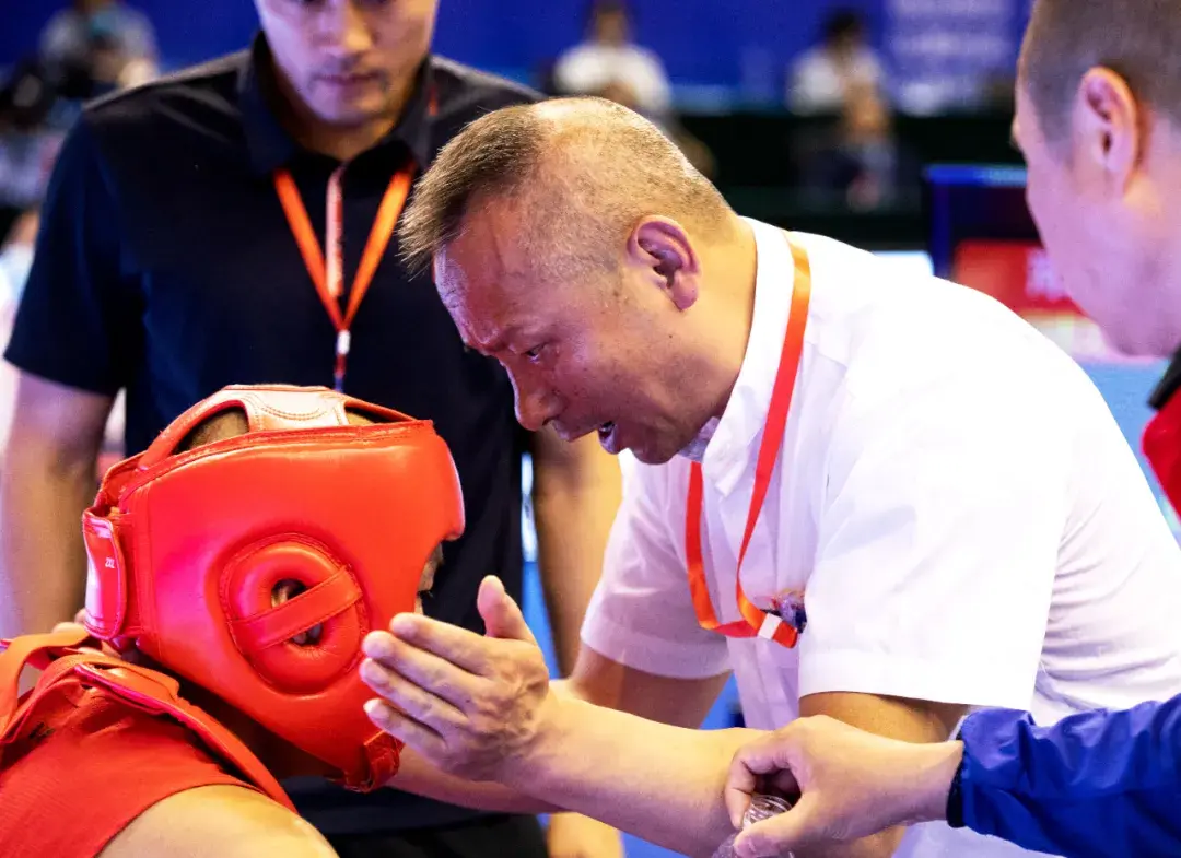 采访福建散打队教练刘献伟:“看队员在上面比赛,紧张吗?”刘献伟答道:“怎么能不紧张?刚做教练时,看队员在上面打比赛,我也在下面左晃右晃,跟着使劲儿,比我自己上场打比赛都紧张。”