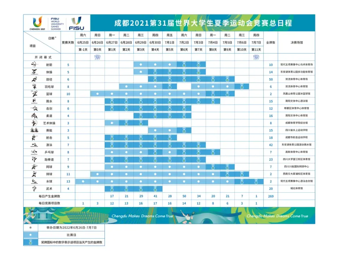 2021年第31届世界大学生夏季运动会原定于2021年8月18日-29日在成都举办。2021年8月26日,成都大运会官网正式公布了成都2021第31届世界大学生夏季运动会竞赛总日程。