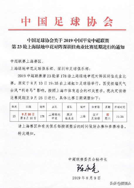 因为受到超强台风“利奇马”影响,上海足协今日发布公告,中超第23轮申花主场和深圳的比赛延期进行。随后中国足协也确认了这场比赛的补赛日期,将放在9月26日进行,即联赛的下个间歇期期间补赛。