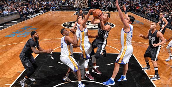 首节双方大打对攻战,克雷-汤普森三分开局,大洛篮下打进,外线命中三分。杜兰特三分张手就有,博格达诺维奇回敬远投。之后大洛佩斯、博格达诺维奇各拿5分,篮网20-12领先。杜兰特、库里回敬一波8-0扳平。林书豪三分,博格达诺奇上篮。汤普森三分反超,霍利斯-杰弗森回敬三分,篮网首节34-33领先。次节霍利斯-杰弗森连续砍分,篮网一波9-0把比分拉大到10分,大洛佩斯命中三分,之后连续下快攻,篮网领先16分。而勇士则陷入各自为战同时手感低迷,上半场49-65落后16分。大洛佩斯半场砍下23分,而勇士三分仅18投4中。