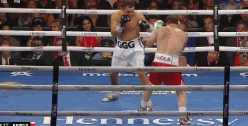第五回合还剩下30秒的时候,戈洛夫金挨了一记重拳之后有些踉跄,他确实很忌惮对手的重拳。