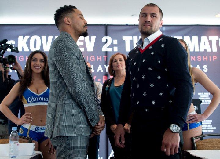 今天,现WBA/IBF/WBO轻重量级拳王美国“上帝之子”安德烈-沃德(31-0,15KO)和前轻重量级三冠王俄罗斯“碎骨机”谢尔盖-科瓦列夫(30-1-1,26KO)再次打起了口水战,两人约定,6月17日在美国内华达州拉斯维加斯的曼达莱湾大酒店进行一场二番大战,主要是去年11月底的那场一番战太接近太有争议了。相比一番战,二番战更加具有悬念,两人互不相让,先从嘴上开始打。