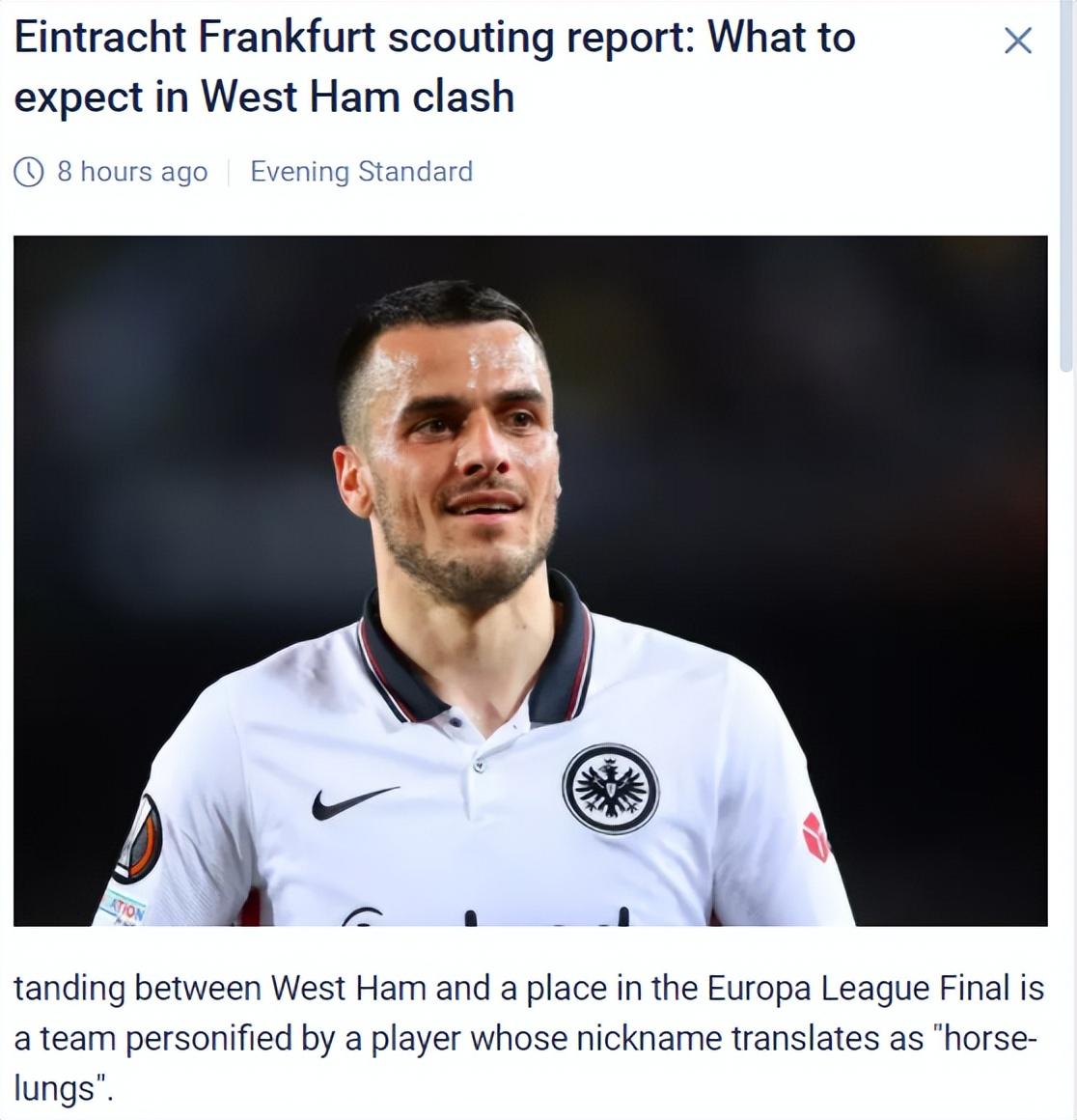 当日,在英国伦敦进行的2021-2022赛季欧罗巴联赛半决赛首回合比赛中,德甲法兰克福队以2比1战胜英超西汉姆联队。