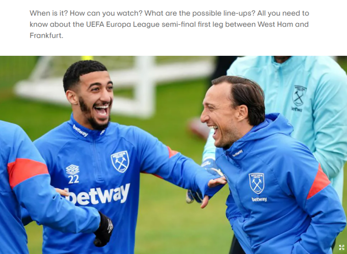 1、西汉姆联时隔46年再次打入欧战四强